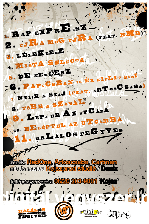 Suppah - Bünti (Kojsz Productions/Base)(prod by Artoscsaba) Eckü+Mentha - Rutinból (Hősök)(prod by Artoscsaba) MC Gőz - Rosszkor rossz helyen (/Kojsz Productions)(prod by Artoscsaba) Flegmadogs - Flegmanarchia(Kojsz Productions)(prod by Copy Con) Deniz - Laza mi? (Kojsz Productions)(prod by Artoscsaba) Artoscsaba - A penge élén 2 (Kojsz Productions)(prod by Artoscsaba) Beatmarket - Lehetsz bárhol(Garage Productions)(prod by Artoscsaba) BMB - Betemet/Nemteccikvalami?(Kojsz Productions)(prod by Cartmen) Szószólók - Hogyha kell (prod by Artoscsaba) Rydu & Barbarfivérek - Míg a májkom soul(Bloose Broavaz)(prod by Artoscsaba) Animal Cannibals - Naonkomo(prod by Artoscsaba) MC Ron - Welcome to my ghetto(prod by Artoscsaba) Funktasztikus - A be nem tartott igéretek földje(Funkton/Kompany)(prod by Artoscsaba)